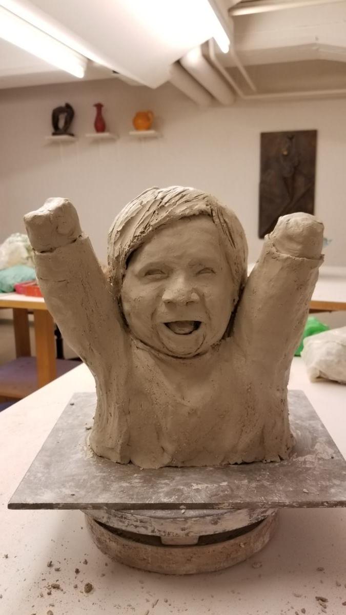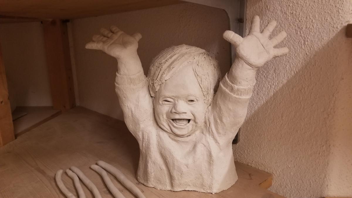 Am dritten Tag arbeite ich nochmals intensiv am Gesicht und forme die Hände. Auch wenn ich finde, dass das Foto noch mehr Lebensfreude ausstrahlt, freue ich mich an der Ausstrahlung der Plastik.