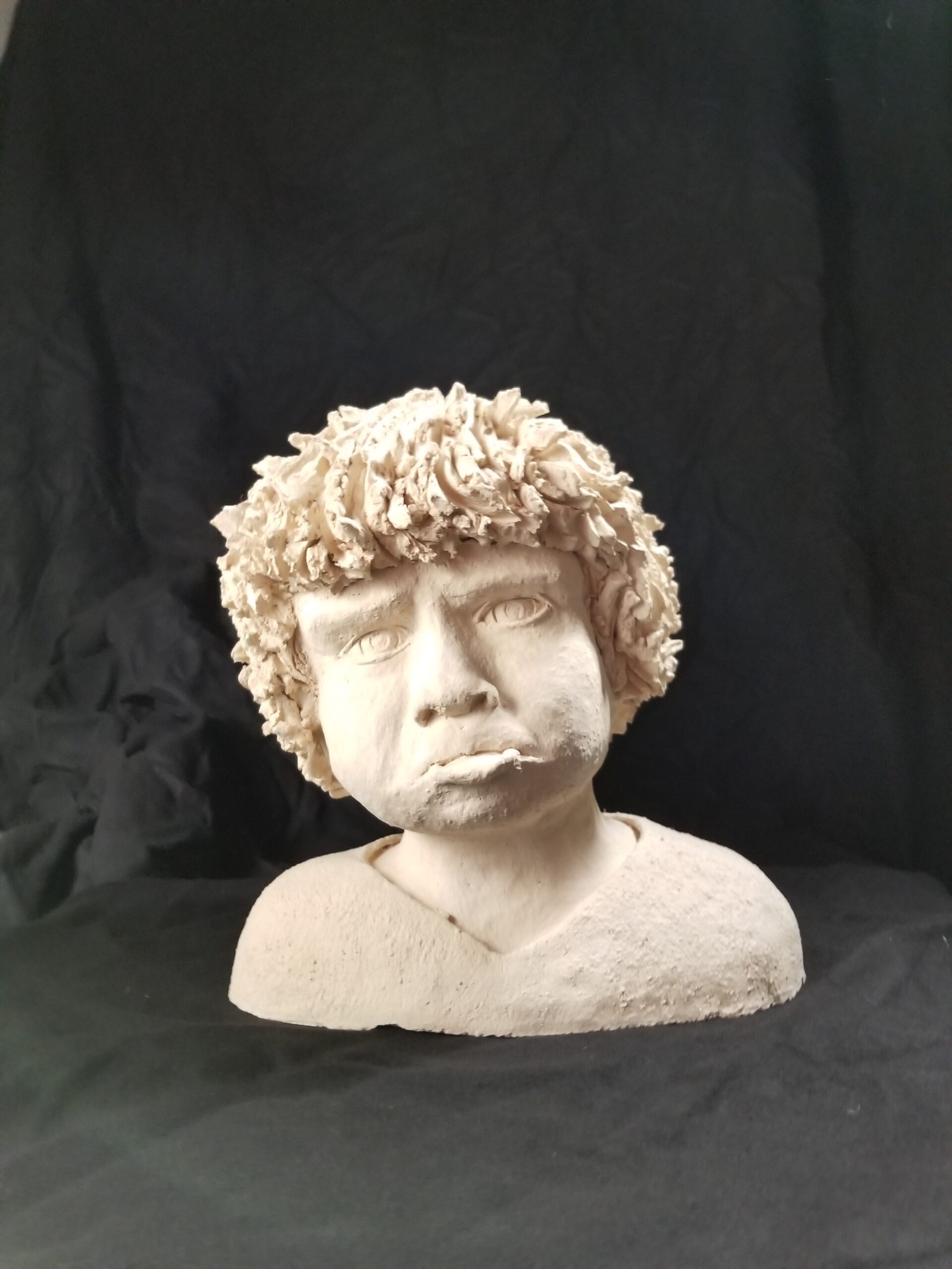 Manchmal kommen Freundinnen mit zum Modellieren – eine nimmt ab und zu auch ihre Tochter mit. So komme ich auf die Idee, sie zu porträtieren. Nachdem ich schon einige Kinder ab Postkarten modelliert habe, wage ich mich nach vielen Jahren das erste Mal wieder an jemanden, den ich kenne. Das Gesicht ist zu breit, aber sonst bin ich ganz zufrieden mit der Arbeit.