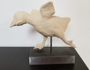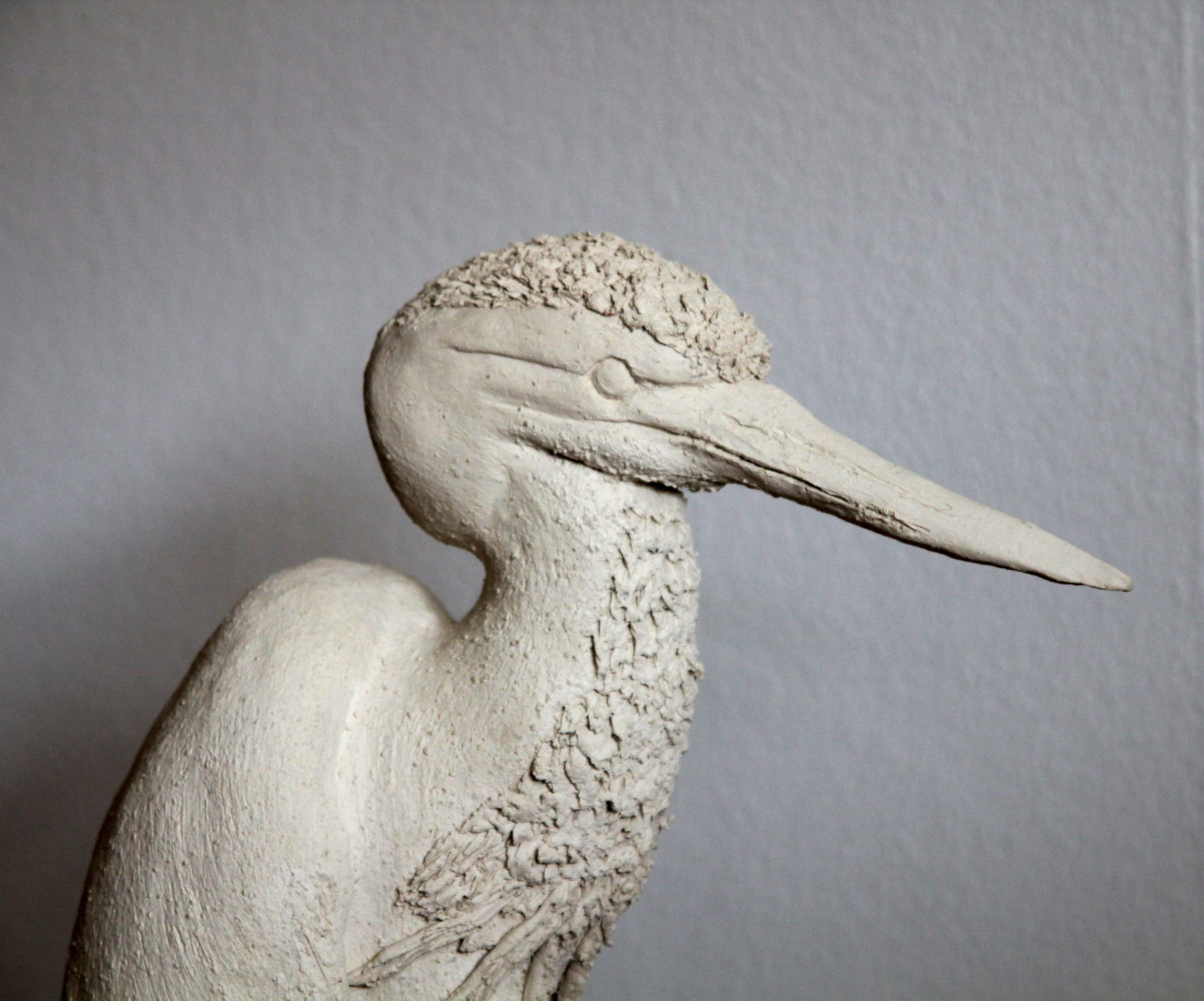 Da ich nicht unsere ganze Wohnung mit Skulpturen füllen kann, frage ich manchmal jemanden, was ich für sie/ihn modellieren kann. Eine Nachbarin antwortete auf diese Frage mit dem Wunsch, dass ich einen Reiher modelliere. Einen Moment war ich ratlos, wie ich das zuwege bringen soll. Aber bald schon kam mir die Idee, den Vogel auf Metallbeine zu stellen und auf einem Sockel zu montieren.